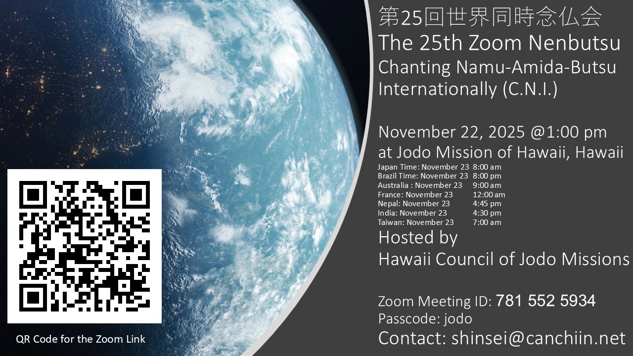 2020年11月の第1回目から今回で25回目の開催で、11月の幹事は浄土宗ハワイ開教区からの中継配信が中心となります。参加者は、それぞれの場所から、ZOOMにアクセスし、オンラインでお念仏を1時間、ご一緒にお称えいたします。皆様どうぞ下記のZoomリンクからアクセスご参加下さいますようお願い致します。
