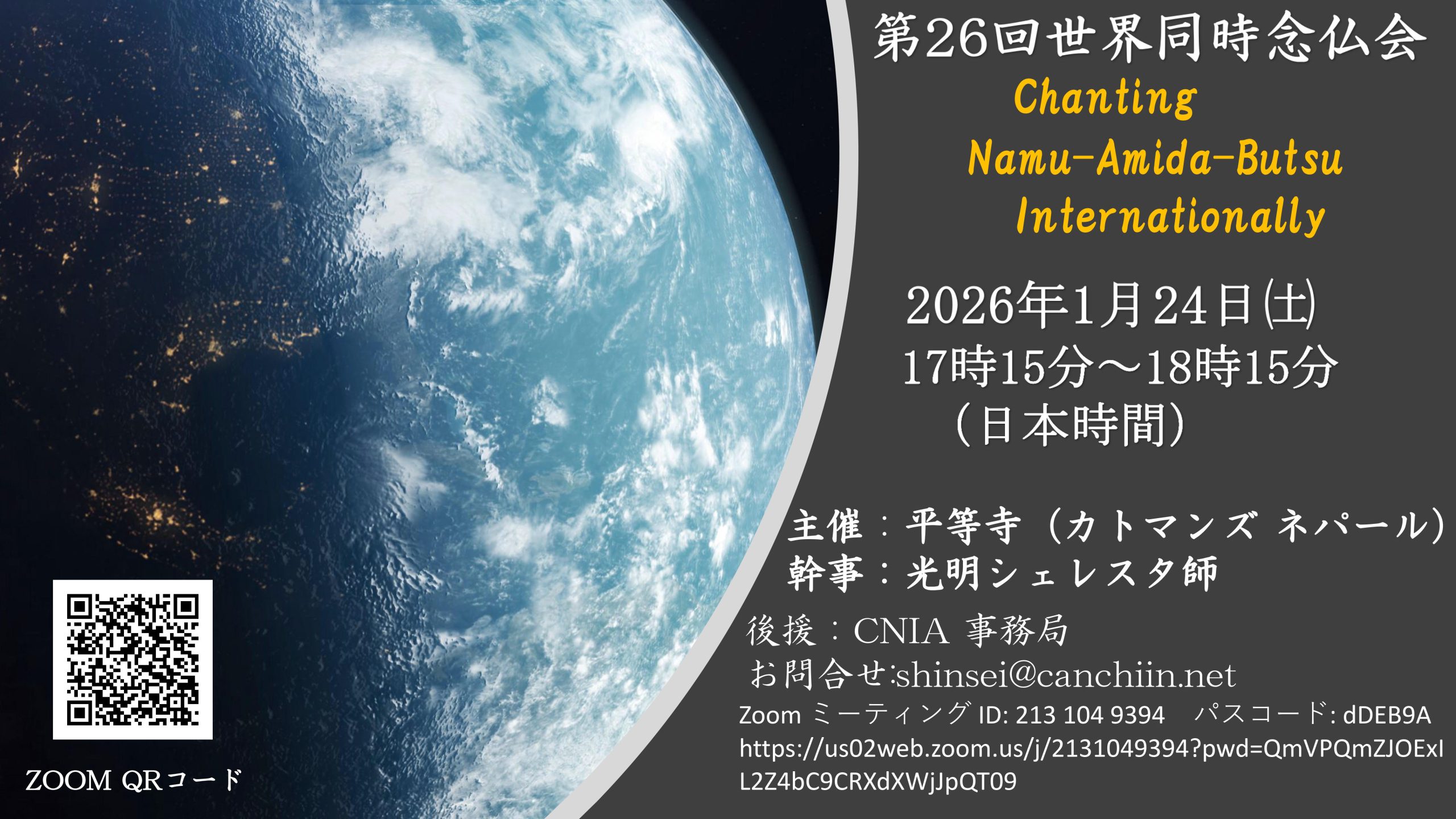 2020年11月に第1回世界同時念仏会を開催し、隔月で世界各地から中継を頂き、今回で26回目の開催で、ネパール・カトマンズの平等寺が中継の中心となります。参加者は、それぞれの場所から、ZOOMにアクセスし、オンラインでお念仏を1時間、ご一緒にお称えいたします。皆様どうぞ下記のZoomリンクからアクセスご参加下さいますようお願い致します。今後も、世界同時念仏会は、24時間不断念仏会と連携をしながら開催してまいります。