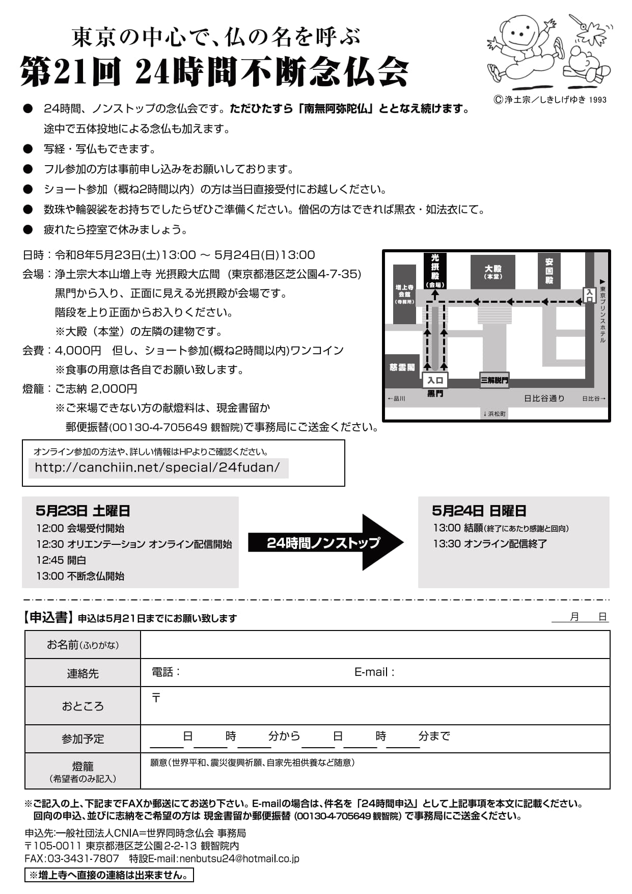 お問合せ・申込先:24時間不断念仏会実行委員会 〒105-0011東京都港区芝公園2-2-13 観智院内 TEL:050-5809-9446(受信専用・会期中) FAX:03-3431-7807 本行事特設E-Mail : nenbutsu24@hotmail.co.jp ※増上寺への問合せはご遠慮下さい。連絡は必ず24時間不断念仏会事務局へお願いいたします。